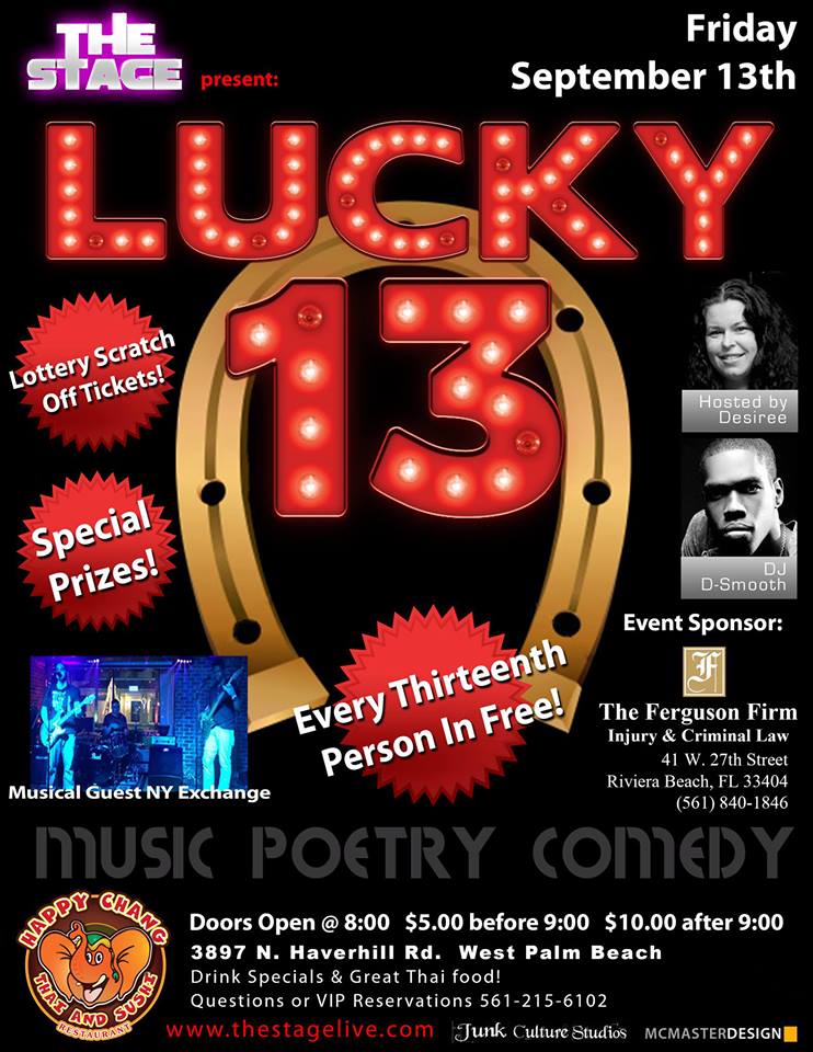 Let’s break mirrors, walk under ladders, and step on cracks and still have a great night! As we turn Friday the 13th into your luckiest night yet! Not only will there be amazing talent! Poets, Singers, and Comedians! But there will be giveaways!!!!!!! Everyone likes something free right??? The first 20 people will get free lottery scratch offs and every 13th person will get in FREE!